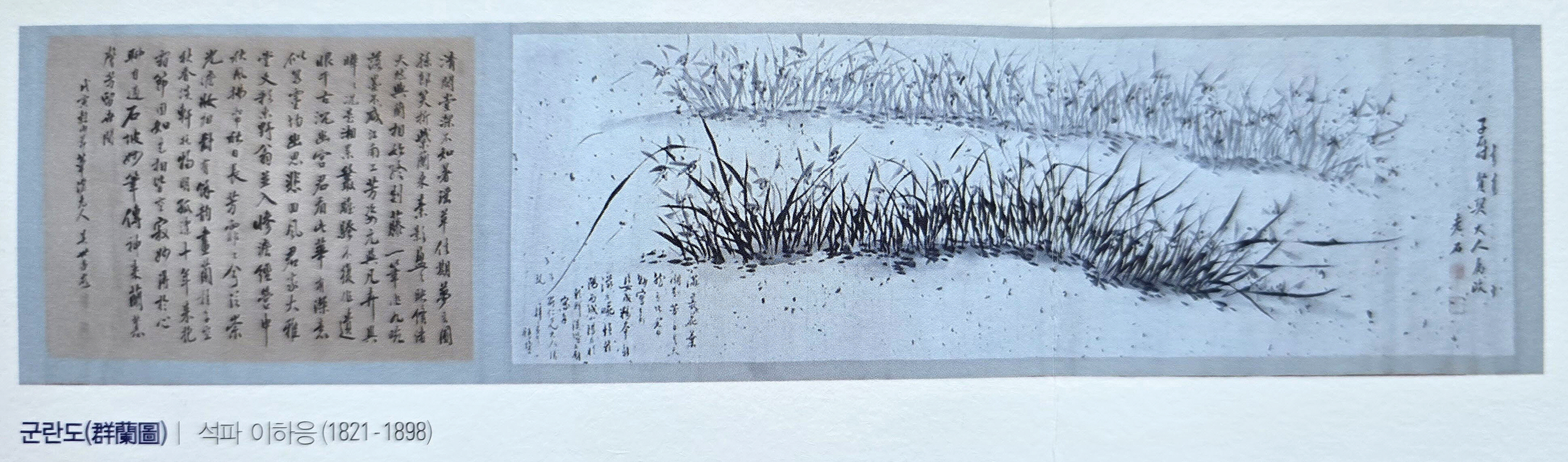 위창 오세창의 찬문이 달린 석파 이하응의 <군란도>는 바닥에 길게 펼쳐져 있고, 운미 민영익의 <건란도 병풍>은 그 옆자리를 차지하고 서 있었다. 두 사람의 붓끝에서 피어난 난초의 잎은 멀리서 보면 닮은 듯하지만, 가까이 다가서면 확연히 달랐다. 난잎은 구한말이라는 격랑의 시대를 살아낸 내면의 풍경이자 시대정신의 은유였다.
