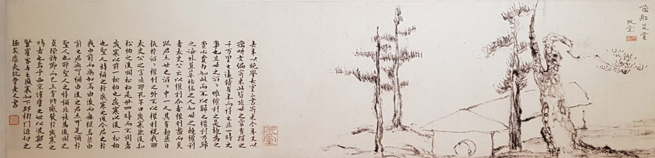 이번 사행(使行)길에 이 그림을 가지고 연경(燕京)에 들어가 표구를 해서 옛 지기知己분들께 두루 보이고 시문(詩文)을 청하고자 합니다. 다만 두려운 것은 이 그림을 보는 사람들이 제가 참으로 속세를 벗어나고 세상의 권세와 이득을 초월한 것처럼 여기는 것이니 어찌 부끄럽지 않겠습니까? 참으로 과당하신 말씀입니다.