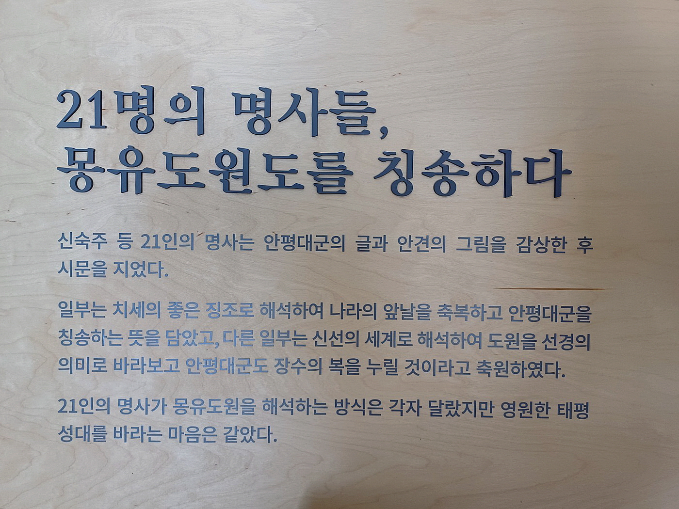 “옛사람이 말하기를 '낮에 한 일이 밤에 꿈이 된다' 하였는데, 나는 궁중에 몸을 담아 밤낮으로 바쁜데 어째서 그때 꾼 꿈이 도원에 이르렀는가?” 뒷날 이 그림을 구해서 나의 꿈을 상상한다면 반드시 무어라고 할말이 있으리라. 꿈을 말한 후 사흘째 되는 날 그림이 완성되었고, 비해당(匪懈堂)매죽헌(梅竹軒)에서 쓴다. 라고 되어있다.