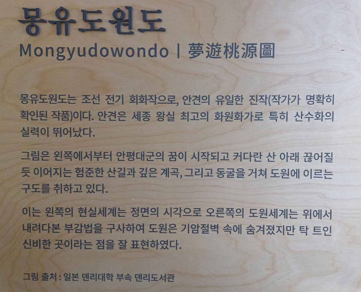 몽유도원도는 1447년(세종 29년) 안평대군이 꿈에서 도원을 거닌 이야기를 듣고 안견이 3일 동안 그린 그림입니다. 현재 일본 덴리대학 중앙도서관에 소장되어 있으며, 일본 중요문화재로 지정되어 있습니다. 이 그림이 어떤 경로로 일본에 건너가게 되었는지는 정확히 알려져 있지 않습니다.