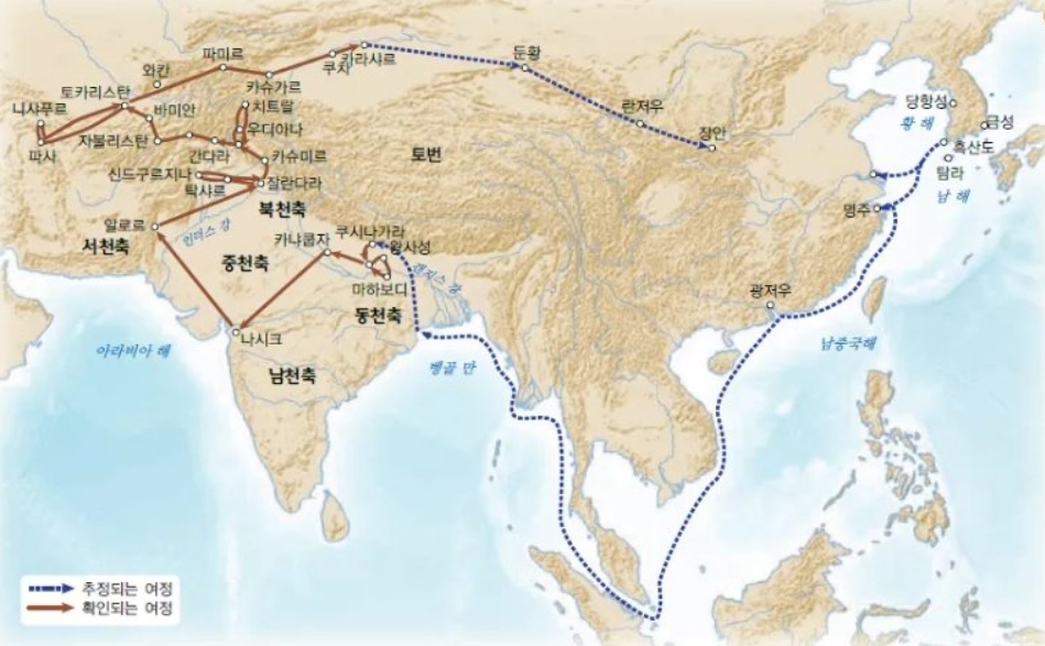 혜초(慧超, 704-787)는 신라인으로 16세 때인 선덕왕 18년(719년) 당나라로 들어갔다. 719년 당나라 광주(廣州)에 도착하여, 남천축 출신의 밀교승 금강지(金剛智 669-741)를 만나 그를 사사(師事)했다. 금강지의 권유로 723년에 광주를 떠나 스승이 건너온 바닷길을 거꾸로 잡아 폐사리국( 현재 인도 동북부 바이샬리)에 도착하여, 갠지스 강을 따라 바라나시∙카슈미르∙페르시아 지방 등 인도와 아랍 일대를 순유하고, 727년 11월 상순에 안서도호부(安西都護府) 소재지인 구자(龜慈; 현 신강 위구르 자치구의 Kucha)를 거쳐 장안으로 돌아왔다. 혜초가 이동한 경로는 육로로만 1만km가 넘고 기간은 장장 4년에 걸친 멀고 긴 여정이었다. 혜초는 고행을 자초하면서 죽음을 무릅쓰고 다른 세계로 걸어 들어가서 직접 보고 듣고 체험한 이문명(異文明)에 대한 기록을 남긴 위대한 여행자요 순례자였다.