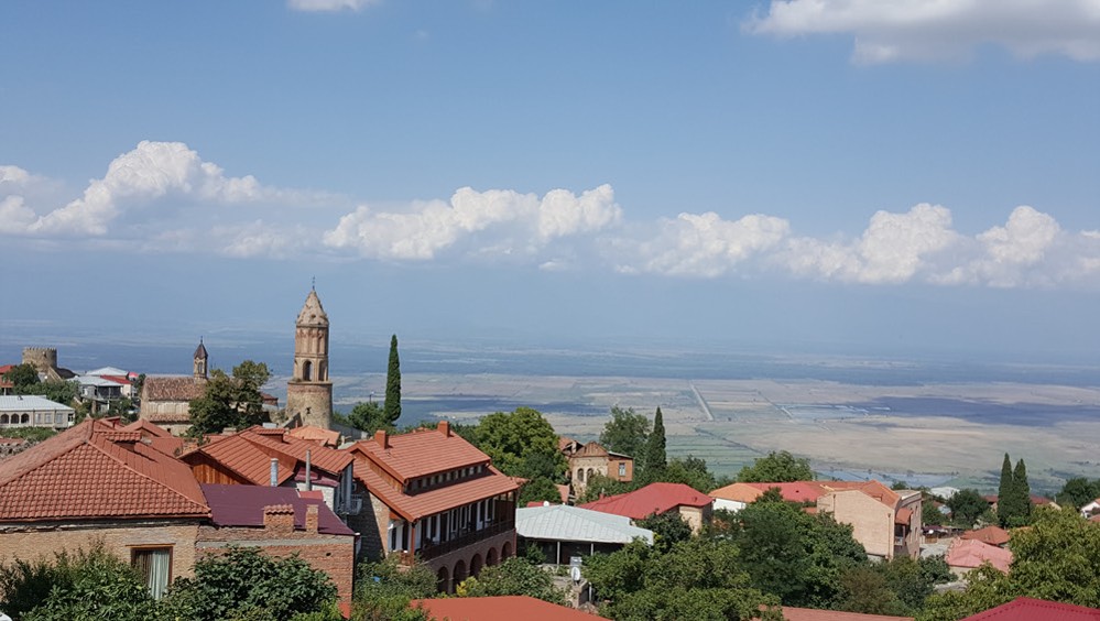 시그나기는 조지아의 작은 도시인데, 이름이 참 독특하다. '피난처'라는 뜻을 가지고 있다. 전쟁이 많았을 때, 조지아 왕이 이곳에 성을 쌓고 백성들을 이주하게 했다는 데서 유래했단다. 굽이진 언덕 위에 자리 잡은 시그나기는 아름다운 성곽을 숲으로 둘러쌌다. 시그나기는 높은 종탑과 붉은 지붕이 예쁜 건물들이 언덕 위에 자리 잡고 있어서 동화 같은 풍경이다. 성곽을 따라 걸으면 눈앞에 펼쳐진 파노라마는 그야말로 장관이다. 코카서스산맥의 웅장한 연봉들이 흰구름을 머리에 이고 병풍처럼 둘러서 있고, 그 아래로는 끝없이 이어지는 카헤티 평원의 포도밭이 따가운 햇살 아래 반짝인다. 왜 이곳을 '사랑의 도시'라 부르는지 알 것 같았다. 나는 이 멋진 인생 풍경과 ‘백만송이 장미’ 사연에 나도 모르게 마음을 빼앗겼다.