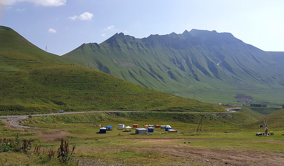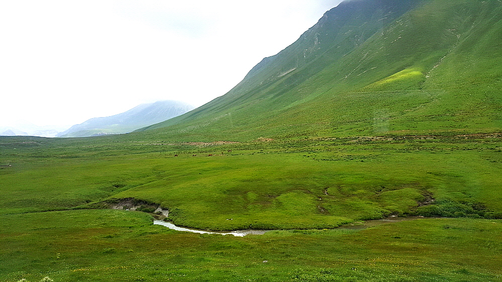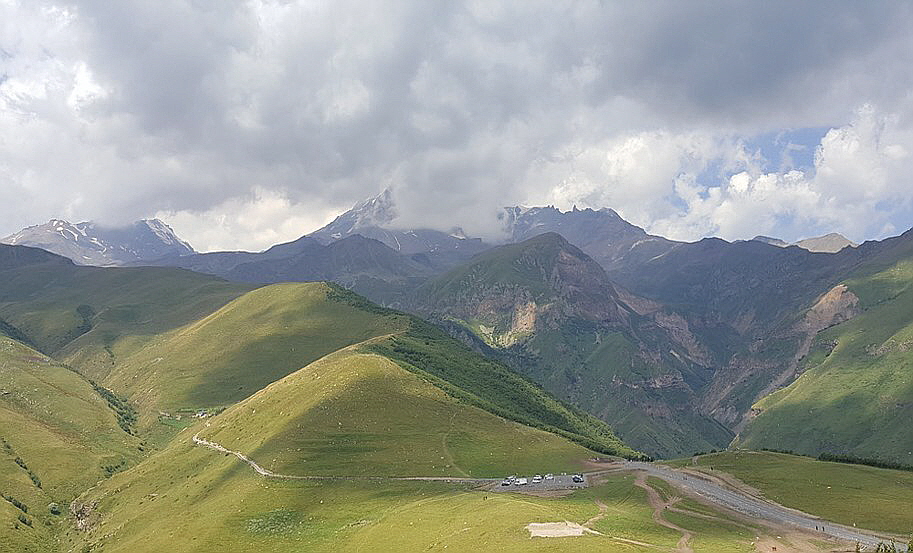 구다우리에서 카즈베기(스테판츠민다)로 이어지는 길은 코카서스의 심장을 관통하는 여정이다. 이 길은 ‘조지아의 군사도로’라 불리는 역사 깊은 도로로, 해발 2,000미터를 넘나드는 고산지대를 따라 이어진다. 도로는 구불구불, 지그재그 산길로 연결되며, 아찔한 절벽을 지나면 끝없이 협곡과 산맥 사이로 이어진다. 협곡 사이 강이 흐르고 군데군데 양떼들이 느릿하게 오르내리는 이 길은, 어쩌면 물가가 저렴한 알프스를 닮은 풍경으로 보이고 한편으로는 몽골 초원의 거친 숨결도 느껴진다. 푸드트럭이 있는 작은 전망대에서 잠시 멈춰 숨을 고르며 엄청난 카즈베기 산맥의 높이와 깊이와 넓이를 감상했다.