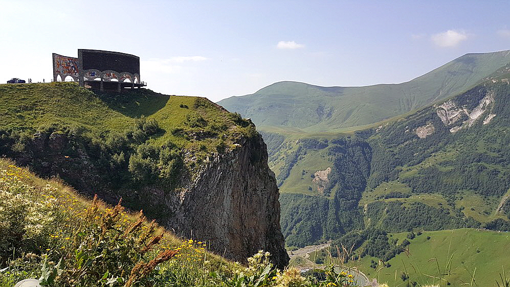 해발 약 2,200미터 고개를 넘는 길목에 이르면 구다우리의 랜드마크, 거대한 원형 구조물이 시야를 압도한다. 이곳은 1983년에 조지아-러시아 우호기념으로 세운 조지아기념탑이란다. 원형의 벽면 안쪽은 조지아와 러시아의 역사와 전설을 담은 화려한 모자이크 타일화로 장식되어 있다. 중앙에는 성모 마리아가 아기 예수를 안고 있는 모습, 좌우에는 영웅과 민담 속 인물들이 등장한다지만 이 내용을 이해하기에는 내 지식이 턱없이 부족하다. 이 구조물의 진짜 매력은 그 너머에 있다. 악마의 협곡이라 불리는 아찔한 절벽과 그 뒤로 펼쳐지는 코카서스 산맥의 파노라마다. 이곳에 서면, 인간의 손길이 닿지 않은 대자연이 얼마나 장엄한지를 실감한다. 패러글라이딩을 즐기는 이들이 하늘을 가르며 날아오르고, 바람은 구조물의 곡선을 따라 울림처럼 퍼져나간다.