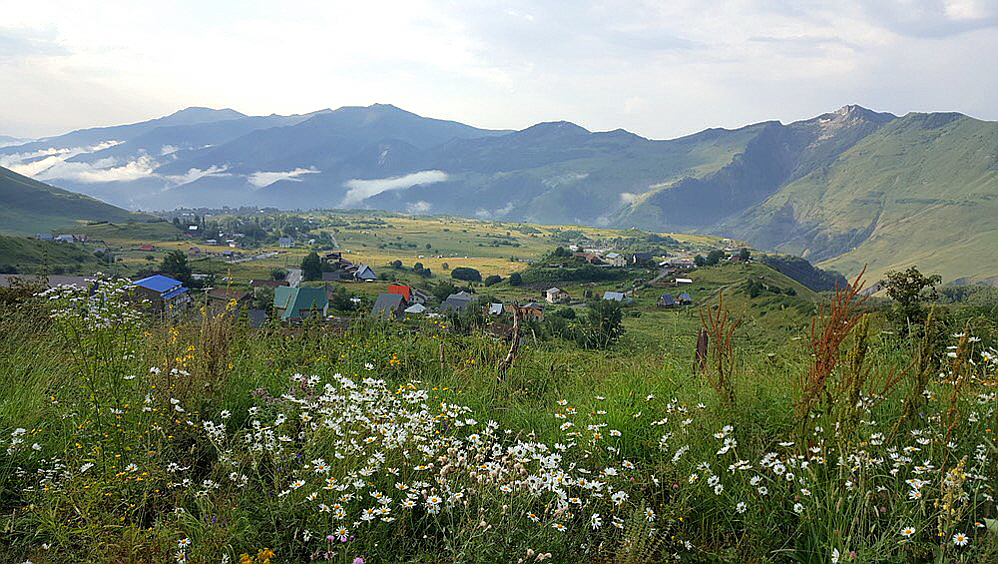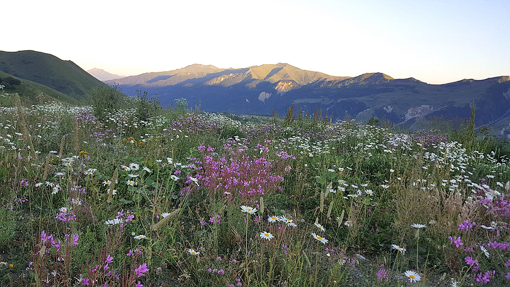 해발 2900미터 고원지대에 자리한 구다우리에 도착하자 숨이 조금 가빠지지만 그보다도 풍경에 압도되어 말문이 막혔다. 눈앞에 줄지어선 코카서스 준봉들. 해질 무렵, 붉은 노을이 산 능선을 따라 흘러내리고 야생화 군락지에 붉은 빛이 스민다.