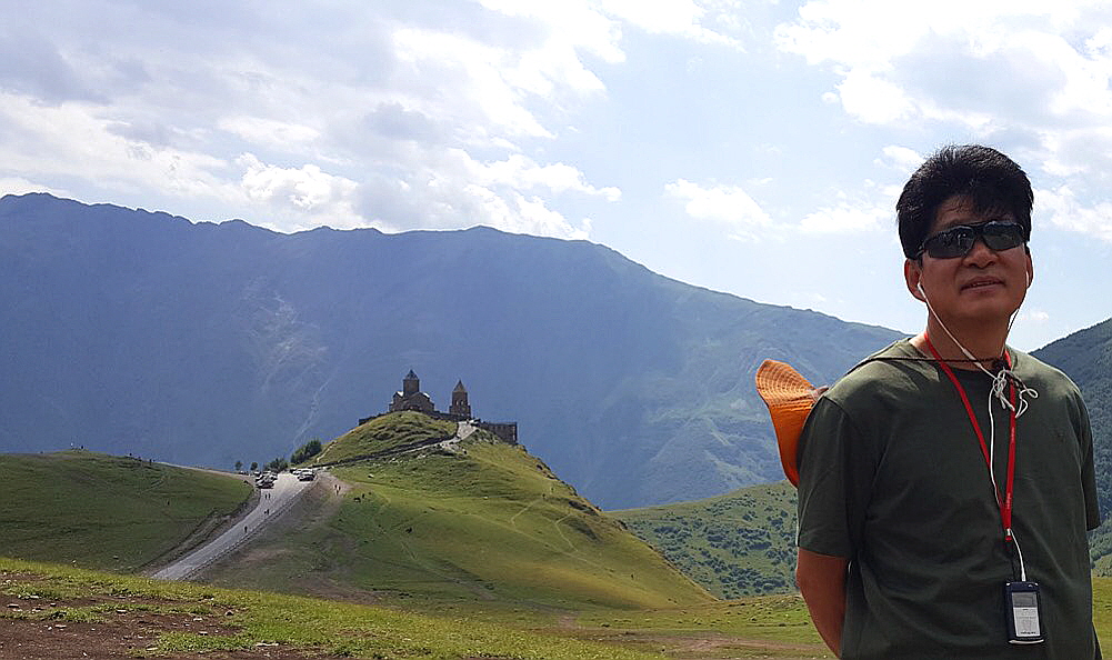 언덕 위의 게르게티 츠민다 사메바 교회에 오르는 길은 험했다. 아무리 교회가 신의 선물이라지만 무신론자에게 ‘수도의 길은 고달프다’는 생각을 하며 올랐다. 4세기에 지어진 이 교회는 한때 외세의 침입을 피해 므츠헤타의 유물과 성 니노의 십자가를 숨겨두었던 장소이며, 소련 시절에도 예배가 중단되지 않았던 유일한 교회로 알려져 있다. 하지만 그 끝에서 마주하는 풍경은 숨이 멎을 만큼 아름답다. 교회 앞 언덕에 서면, 발밑에는 카즈베기 마을의 붉은 지붕들이 옹기종기 모여 있고, 그 너머로는 코카서스의 거대한 산맥이 병풍처럼 펼쳐진다. 이곳에서 내려다보는 마을은 풍경이 아니라, 시간이 멈춘 듯한 평화다. 시인의 말처럼, ‘침묵조차 노래가 되는’ 순간이다. 그 풍경은 침묵으로 조용히 마음을 적신다. 뒤쪽으로는 카즈베기산이 운무 속에 가려 있다. 바람은 고요하고, 교회 십자가는 하늘을 향해 서 있다. 작은 십자가 하나가 그 풍경을 더욱 신비롭게 만든다. 교회 내부로 들어갔다. 좁고 어두운 하나님의 공간에 침묵이 흐른다. 이곳에서의 침묵은 자연과 인간, 신과의 대화처럼 느껴졌다.