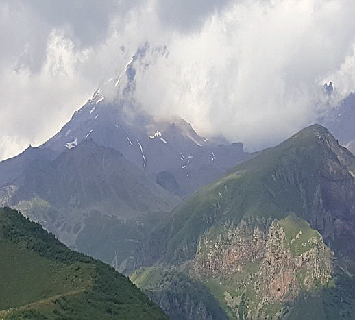 이제 돌아갈 시간이다. 카즈베기산의 모습을 기다리다 지쳐 포기하는 순간, 마침내 저 멀리 구름 속에 가리워졌던 카즈베기산(5047m)이 그 위용을 드러냈다. 오랜 기다림 끝에 정면으로 마주한 카즈베기산은 말 그대로 감정을 삼키게 했다. 코카서스의 영혼, 프로메테우스가 형벌을 받은 산이다. 눈앞의 광경은 풍경을 넘어선 '존재' 그 자체였다. 산은 말이 없지만, 대신 큰 울림을 준다. 자연의 위대함 앞에서 인간은 작고 보잘것없는 존재임을 다시 한번 느끼며, 그 자리에 멈춰 있었다. 카즈베기 영봉은 카메라에 담을 새도 없이 다시 운무에 휩싸이는 아쉬움을 주었다. 감춰진 아름다움이 더 진하게 다가왔다. 잠시나마 이름 없는 길손에 대한 차별없는 베품이라 여기며 감사했다. 이 코카서스의 보석들을 나는 카메라보다 확실한 내 안에 보관해 두었다.