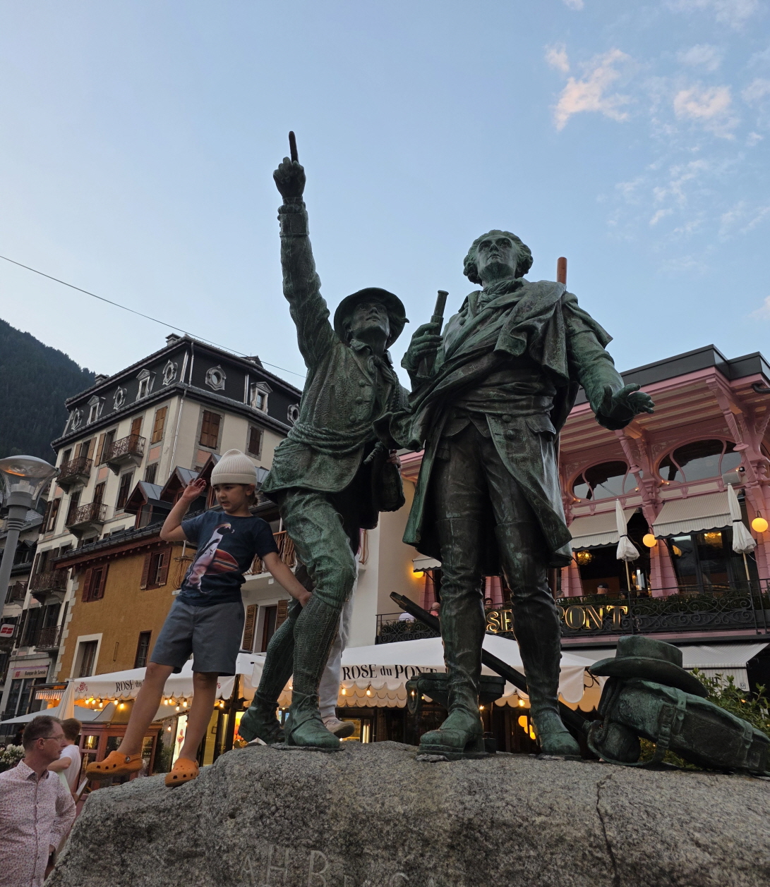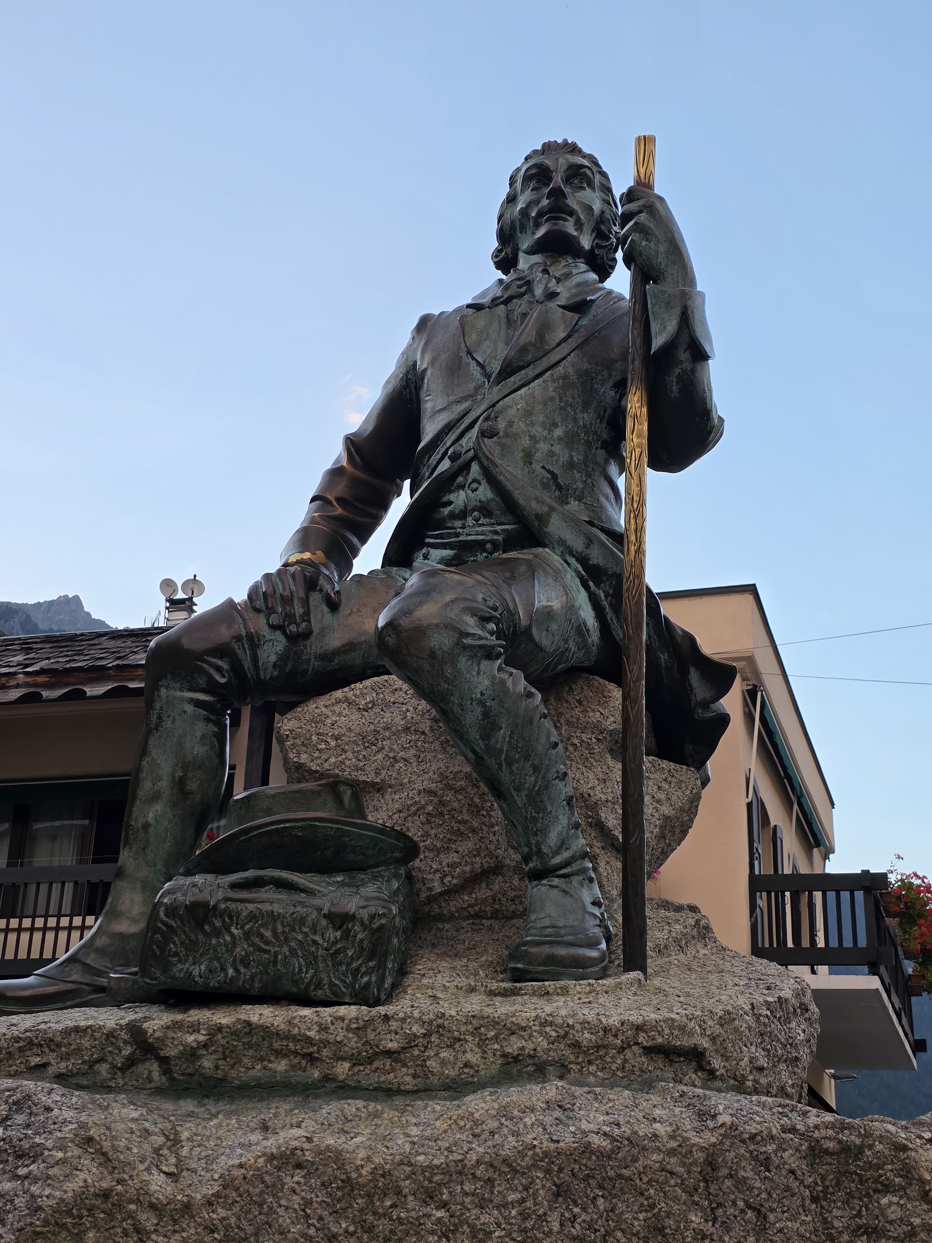 수정 채굴업자 자크 발마는 1786년, 몽블랑 최초 등정에 성공한 알프스 등반의 상징적인 인물이며, 스위스의 자연과학자이자 탐험가인 베네딕트 드 소쉬르는 몽블랑 등정을 위해 상금을 내걸며 발마를 후원했다. 발마는 손을 뻗어 몽블랑 정상을 가리키고 있고, 소쉬르는 그 옆에서 그의 설명을 듣는 듯한 자세로 인간의 도전과 협력, 자연에 대한 경외심을 표현한 역사적 순간을 재현한 동상이다.