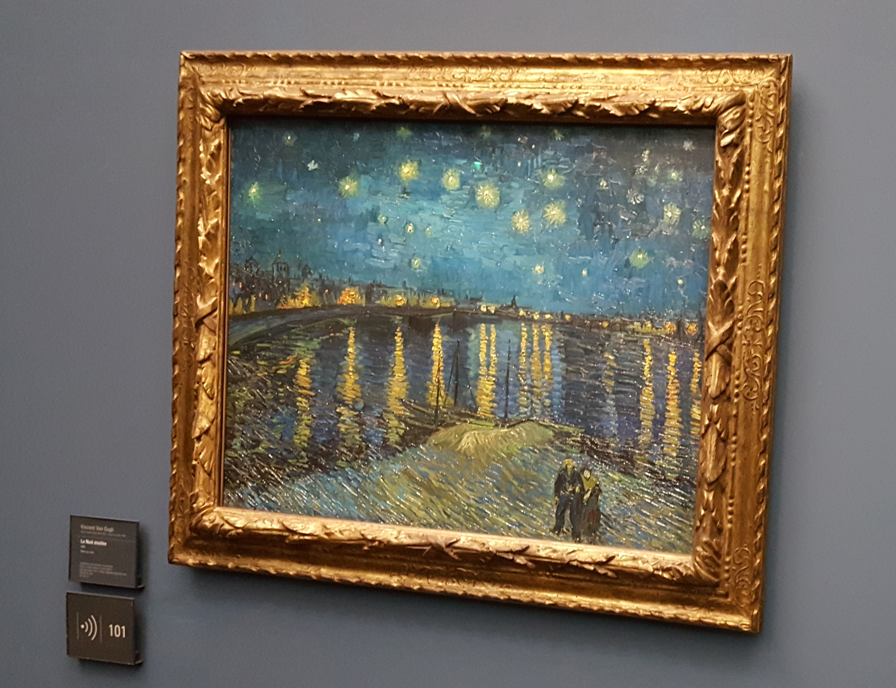 〈론강의 별이 빛나는 밤〉 앞에 섰다. 관람객들로 붐비는 전시장에서 복잡한 틈 사이로 그림을 바라보며, 나는 고흐가 그려낸 평화롭고도 아름다운 밤의 풍경에 잠시 빠져들었다. 어두운 밤하늘 위로 별들이 고요하게 빛나고, 론강은 그 빛을 조용히 반사하며 도시를 감싸 안고 있었다. 별빛은 강렬하면서도 차분했고, 그 아래 펼쳐진 도시 풍경은 마치 꿈속의 장면처럼 아련했다. 무엇보다도, 그림 속 강변을 걷는 연인의 모습은 내게 깊은 인상을 남겼다. 그들은 고흐가 꿈꾸던 평온한 삶과 정서적 연결을 상징하며, 외로움 속에서도 희망과 온기를 품은 존재처럼 느껴졌다. 죽음 이후의 평화를 별빛에 투영했던 고흐의 시선 속에서, 연인은 삶과 죽음, 사랑과 고독이 교차하는 시적 공간의 중심에 있었다. 그래서인지 이 그림은 고흐의 작품 중에서도 가장 마음 편하게 감상할 수 있었고, 조용한 위로처럼 다가왔다.