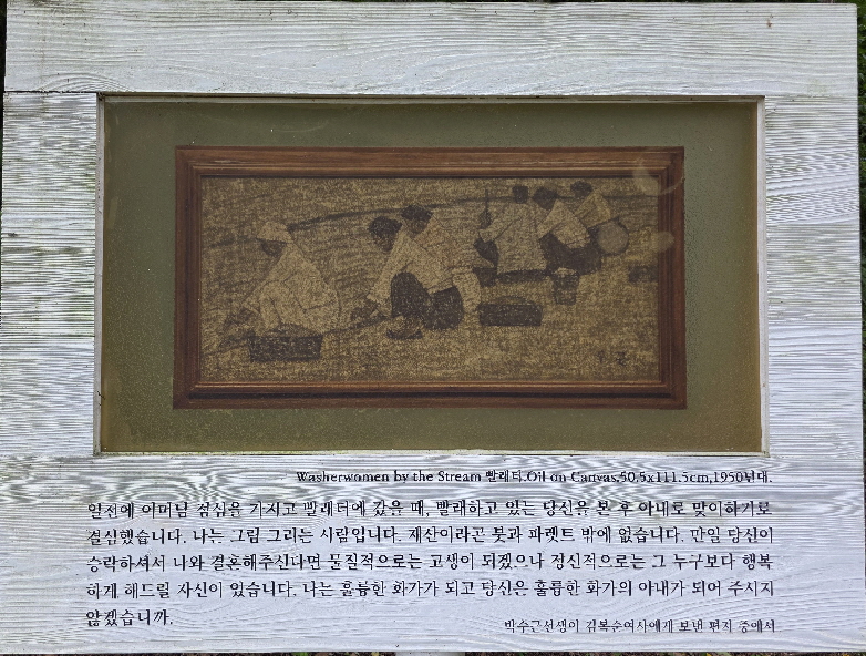 미술관 앞에는 ‘빨래터’가 재현되어 있다. 박수근이 아내 김복순을 처음 본 장소이자, 그의 대표작이 탄생한 공간이다. 그 빨래터는 사랑과 추억, 그리고 예술의 출발점이었다. 청년 박수근은 이 빨래터에서 처녀 김복순을 처음 보았다. 그녀가 물가에서 빨래를 하던 모습을 보고 첫눈에 반했다. 빨래터에서 처음 본 그녀에게 청혼 편지를 보냈다. 초등학교 졸업이 전부였던 박수근과 고등학교를 졸업한 ‘배운 여자’ 김복순. 김복순의 집안에서는 반대가 심했다. 아들의 상사병에 아버지가 나섰다. “내 아들만큼 네 딸을 사랑해줄 사람이 있을 것 같으냐”는 아버지의 한 마디가 결국 그녀와의 결혼으로 이루어졌다. 그들의 사랑은 신분과 조건을 뛰어넘은 진심의 결실이었다. 박수근은 아내를 향한 사랑을 그림 속에 담았고, 김복순은 그의 예술을 지켜낸 헌신적인 동반자였다. 가난과 병고 속에서도 남편을 지지하며, 그의 예술혼을 지켜낸 그녀의 헌신은 몇 번을 들어도 눈물겹다.