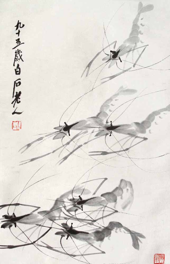 <새우>는 그의 대표작으로 꼽히며, 생명력의 본질을 포착했다. 그는 굵고 묵직한 붓놀림으로 새우의 몸통을 그리면서, 가느다란 선으로 다리와 더듬이를 표현해 투명한 껍질과 섬세한 움직임을 생생하게 드러냈다. 투명한 껍질은 숨길 것이 없는 순수함을, 활발한 움직임은 생명의 끊임없는 생동감을 상징한다. 먹의 농담을 자유롭게 활용해 입체감을 살리고, 새우들이 물속에서 군무를 추듯 흩어져 배치된 구도는 ‘기운생동(氣韻生動)’의 전형을 보여준다. 이는 단순한 사실적 재현을 넘어, 생명의 활력과 자연의 흐름을 담아낸 것이다.