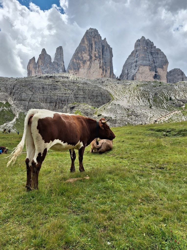 ‘돌로 되어 돌로미티, 돌이 많아 돌마니티’ 돌로미티를 내 방식 대로 이해한 자작시 구절처럼 돌로미티의 길은 평탄한 돌길이었다. 아우론조 산장에서 트레킹을 시작했다. 그곳을 등지고 몇 걸음 옮기자마자, 돌로미티의 상징과도 같은 세 개의 거대한 암봉, 트레치메 디 라바레도였다. 지상에서 가장 큰 이빨과도 같은 모습이었다. 그 사진으로만 보던 피콜라, 그란데, 오베스트. 직접 마주한 삼형제 봉우리의 수직 북벽은 수억 년의 시간을 압축한 듯한 위압감으로 압도했다. 트레킹 코스는 트레치메를 중심으로 한 바퀴 돌게 되어 있다. 세 봉우리는 걸음을 옮길 때마다 모양을 달리한다. 그 아래서 알프스의 소들이 한가롭게 풀을 뜯고 있다. 목장 웅덩이에 비친 트레치메의 반영은 환상적이었다. 시인 바이런이 노래했듯, "산들은 느낌이다(To me, high mountains are a feeling)." 트레치메는 내게 숭고함이라는 이름의 감정이었다. 트레치메를 관망하며 마시는 맥주의 맛은 아주 특별했다. 맥주의 청량감에 돌로미티를 오른 사람들만이 느끼는 쾌감이랄까? 회색빛 너덜겅을 지나고 완만한 목장길을 걷는 내내, 나는 말없이 봉우리를 올려다보았다. 아쉽다. 이 장엄한 봉우리 삼형제를 어찌 두고 떠날 수 있을까. 발걸음은 앞으로 향했지만, 마음은 자꾸만 뒤에 남는 풍경에 얽매였다.